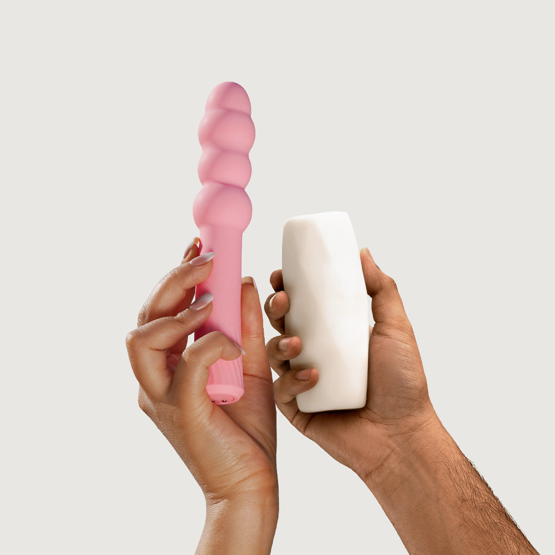 Beads' beaded tip allows for targeted stimulation. Explore hidden bliss points and 9 speeds. Let your partner enjoy Adam's super soft and squishy build with a textured interior. Together, they are the perfect addition to spice up your otherwise vanilla sessions!
