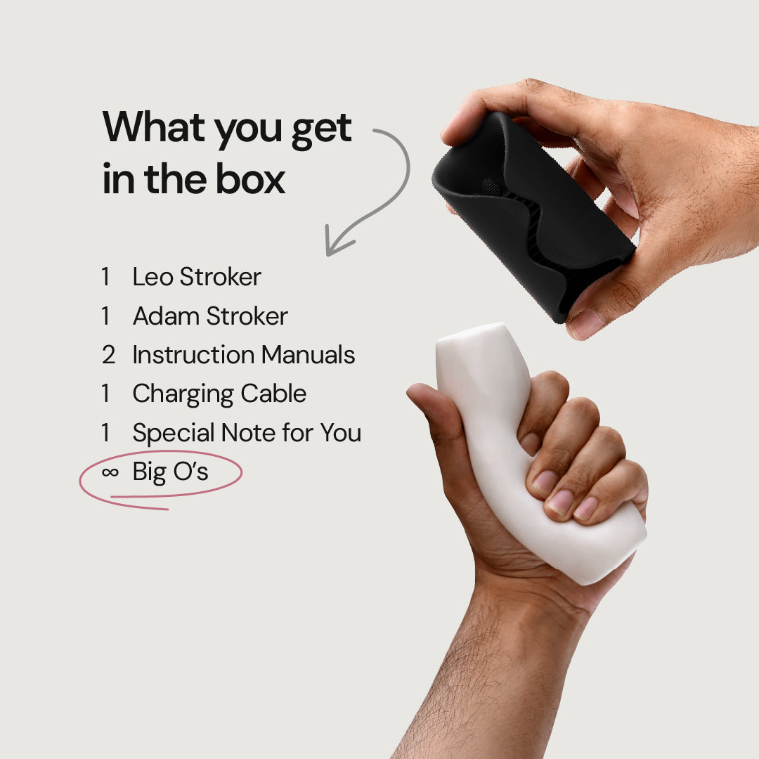 two male hands holding black colored Leo vibrating stroker and white colored Adam manual stroker from Thirdbase held against a white background
